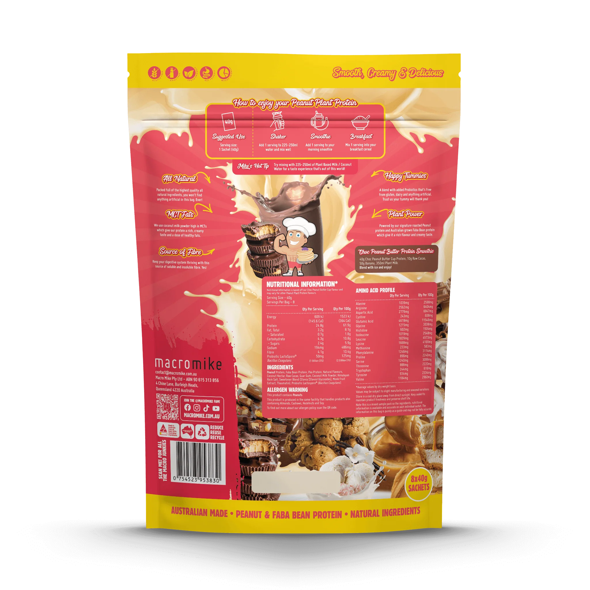 Tired of trying plant-based proteins that all taste the same? We hear you! Most brands use mass-produced formulas and cheap ingredients that do not deliver on taste. That is why we created Macro Mike, a game changing range of protein blends using high-quality Peanut and Faba Bean bases. Our protein is smooth, creamy, and absolutely delicious, unlike anything you have tried before! 💥